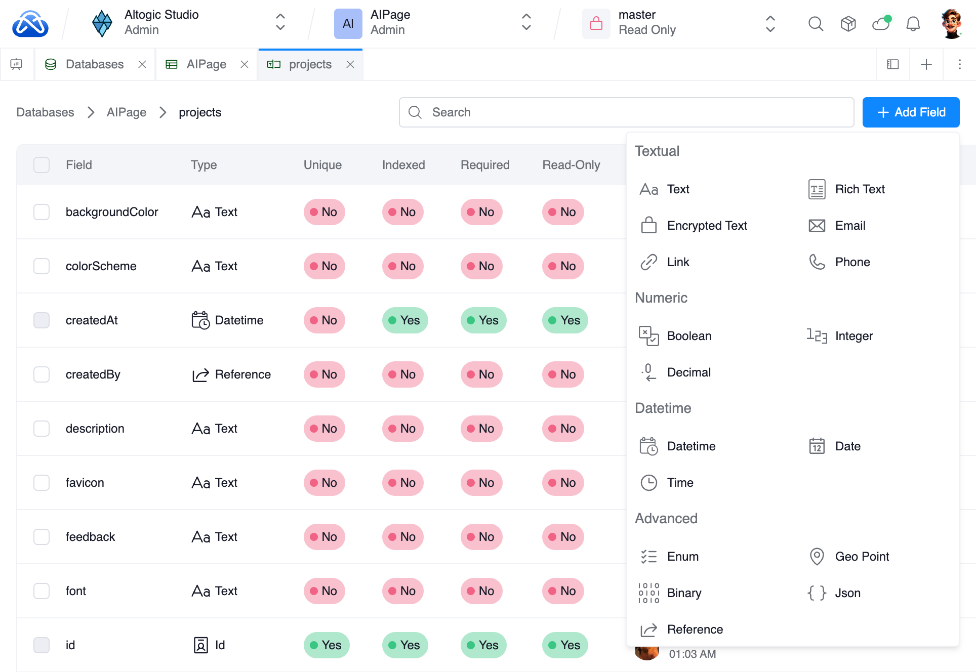 After defining your data model with the appropriate field types and properties, you can start using it in your application. Whenever you need to update the data model, want to change the field types, or add new fields, you can do so easily within Agnost Studio.