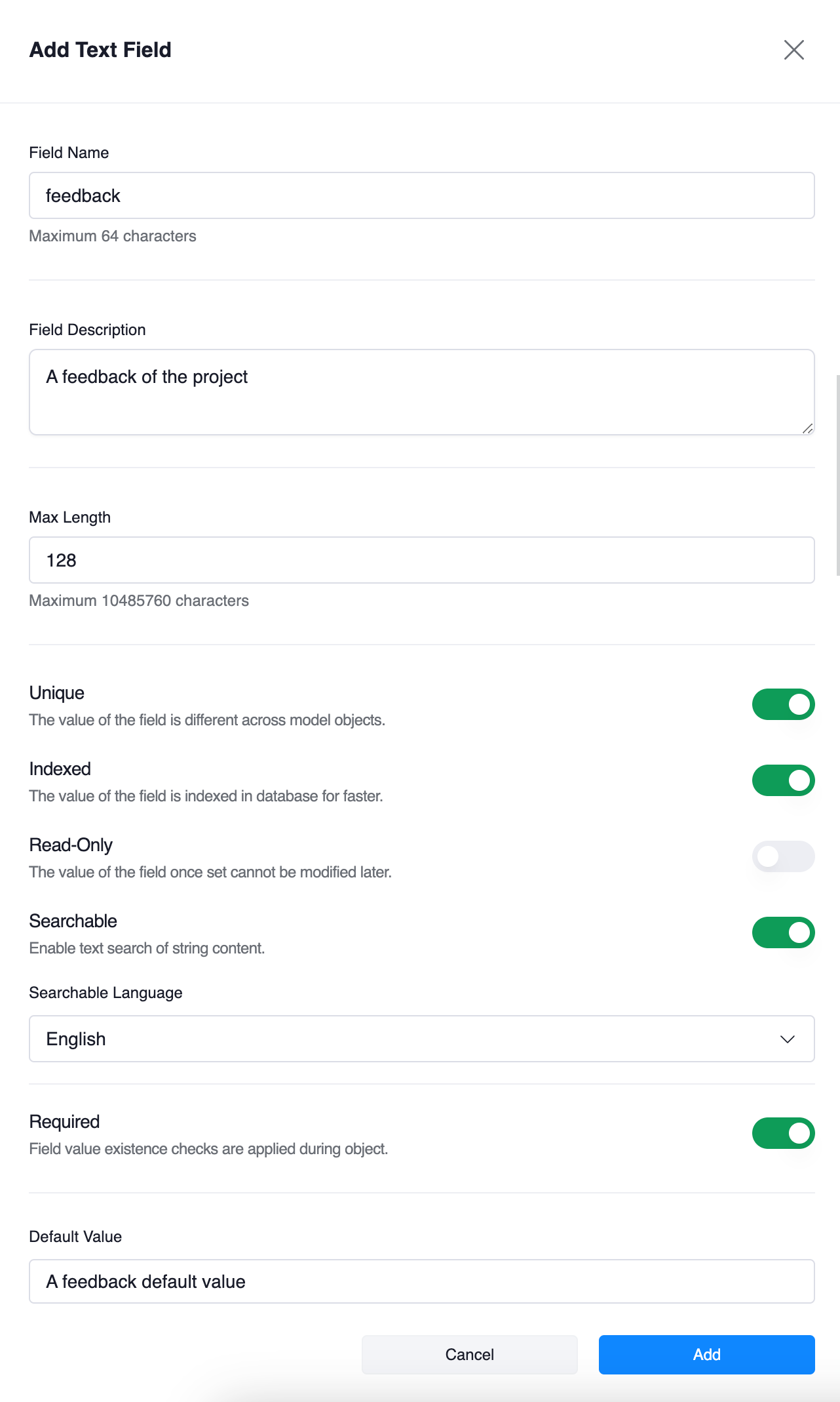 For each field you add to the model, you can configure its properties, such as field name, max length, validation rules, and default values. Agnost Studio provides an intuitive interface for adjusting these settings.