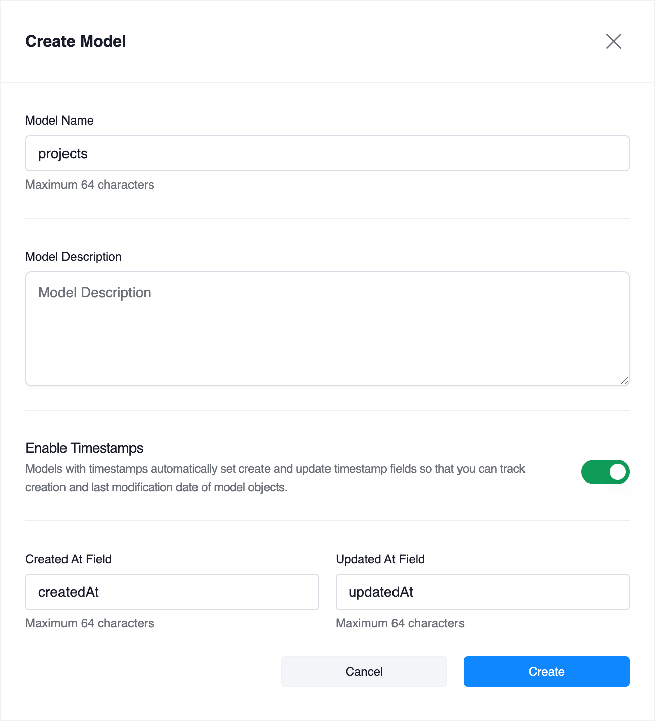 Enable Timestamps: You can choose whether to enable or disable default timestamps for your model. Timestamps typically include fields like