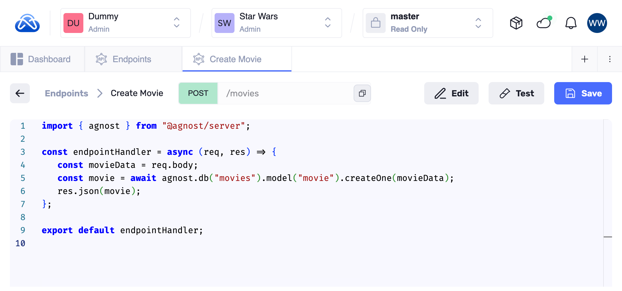 const movie = await agnost.db("movies").model("movie").createOne(movieData)