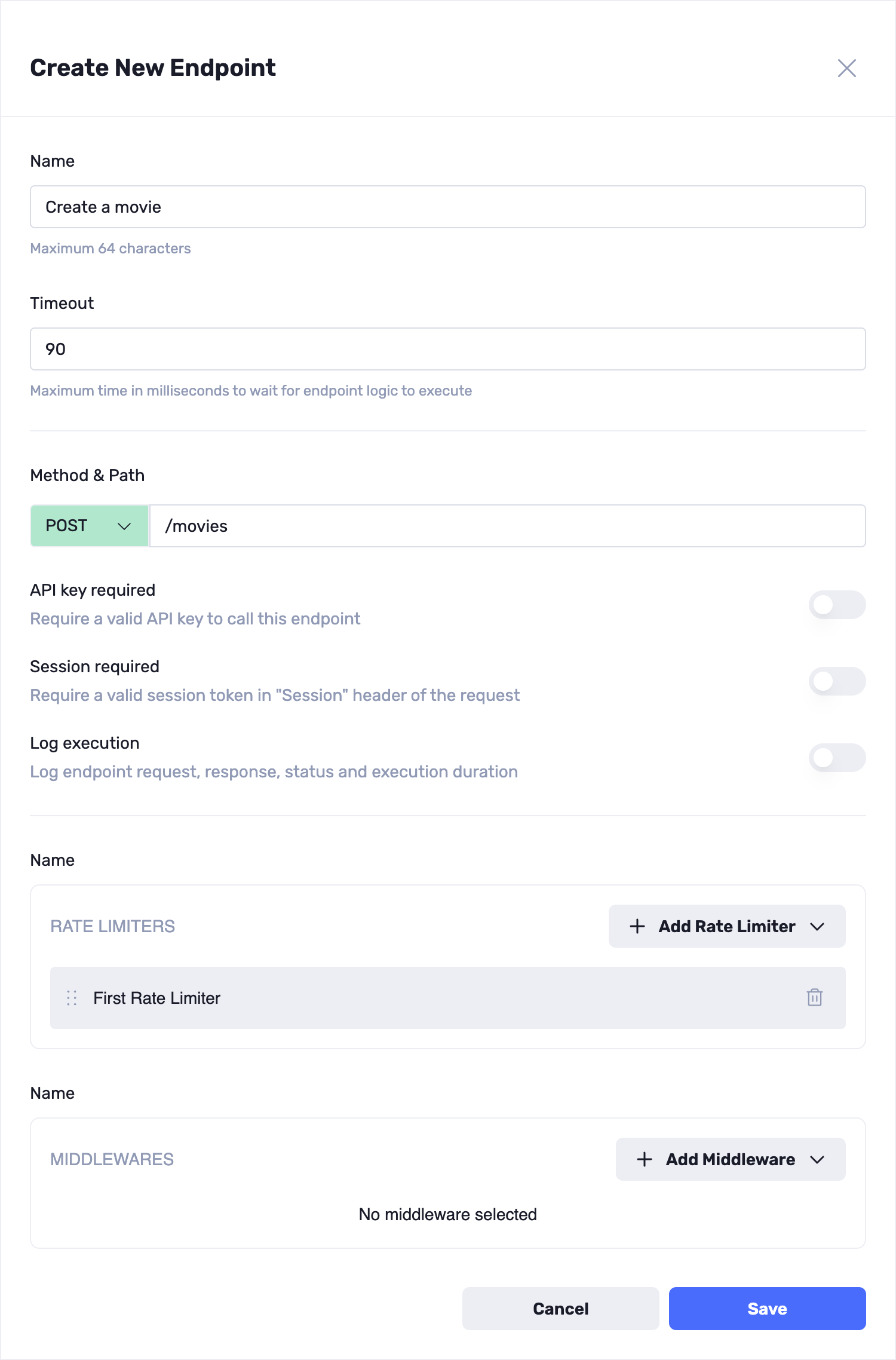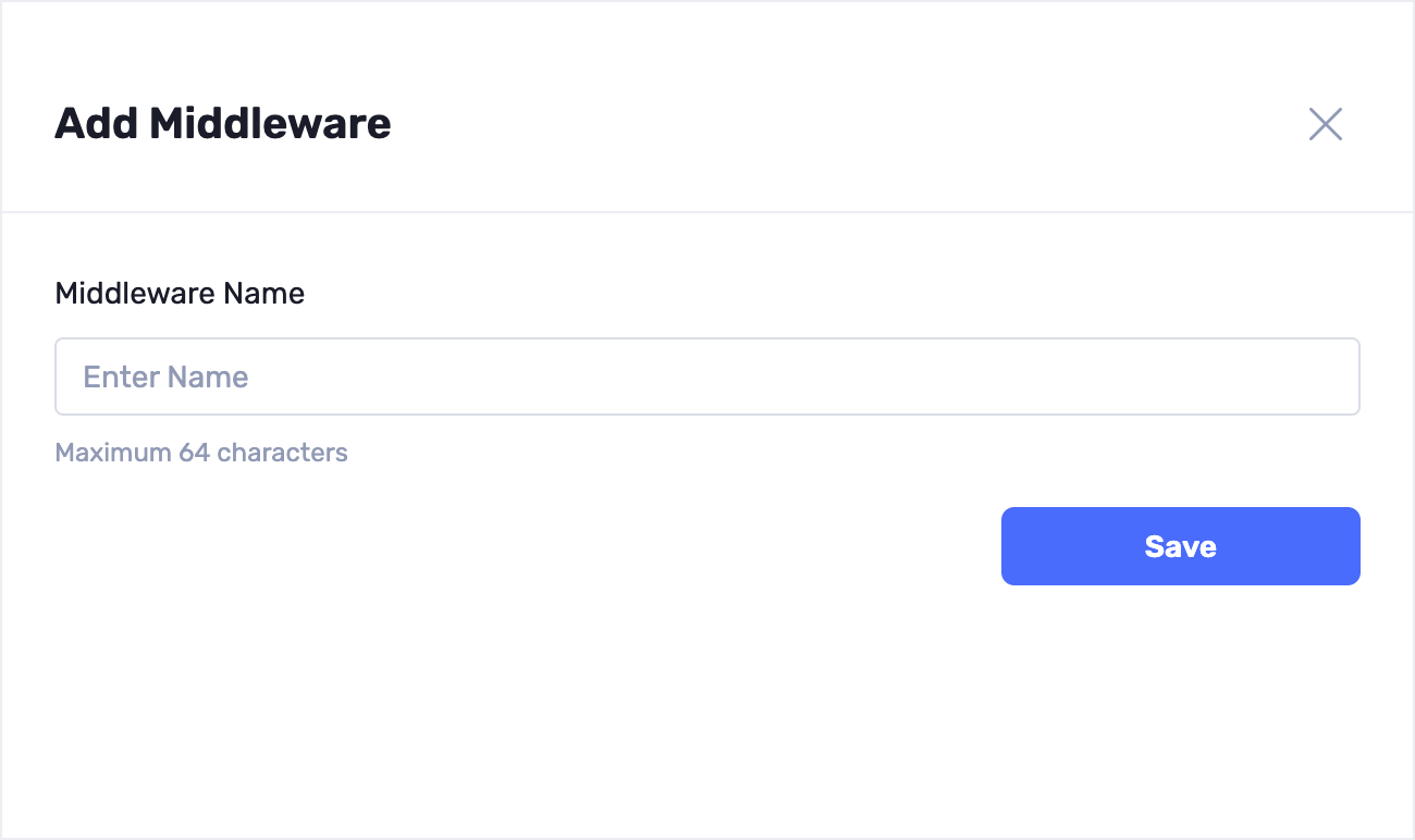 - Click the + Add Middleware button to add middleware components that perform specific tasks, such as authentication, request validation, or data transformation. You can choose from a list of available middleware or create custom middleware to suit your requirements.