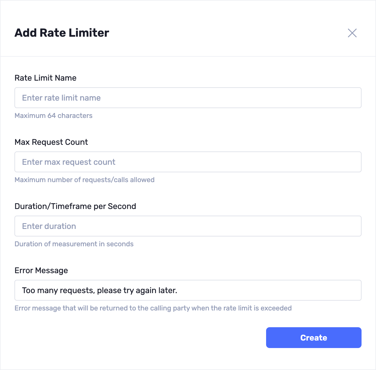 - Click the + Add Rate Limiter button to configure rate limiting for your API endpoint. Define the rate limiting settings to control the number of requests allowed within a specified time frame.