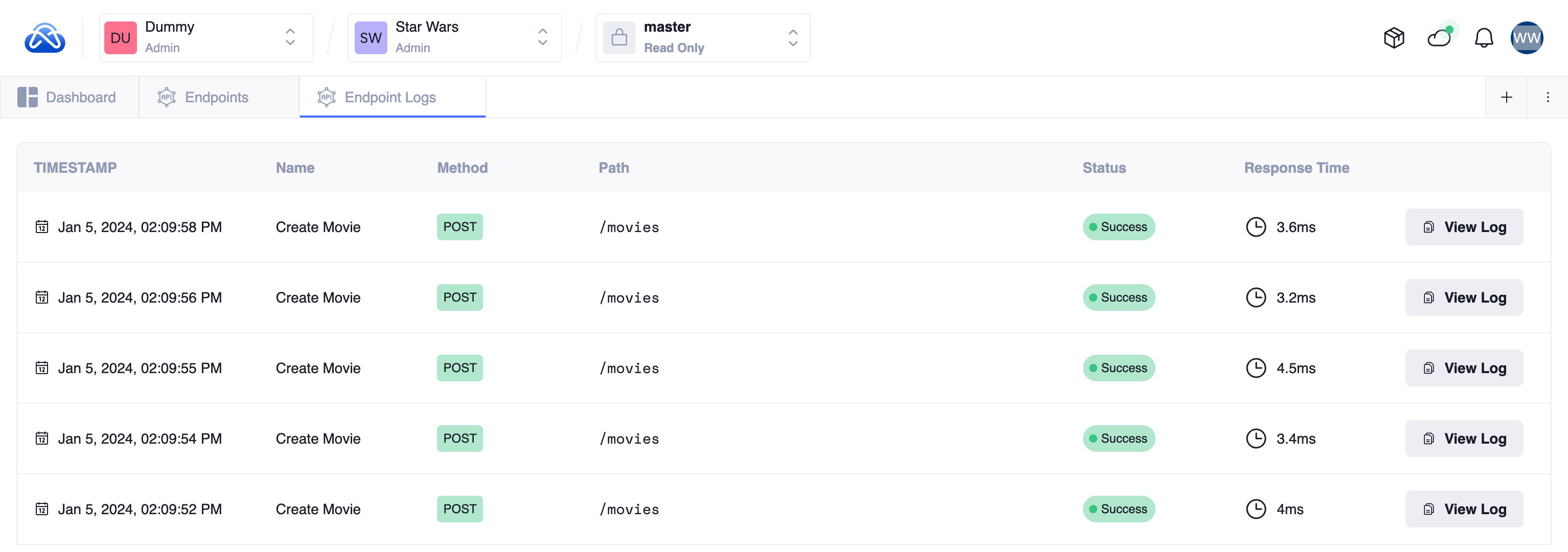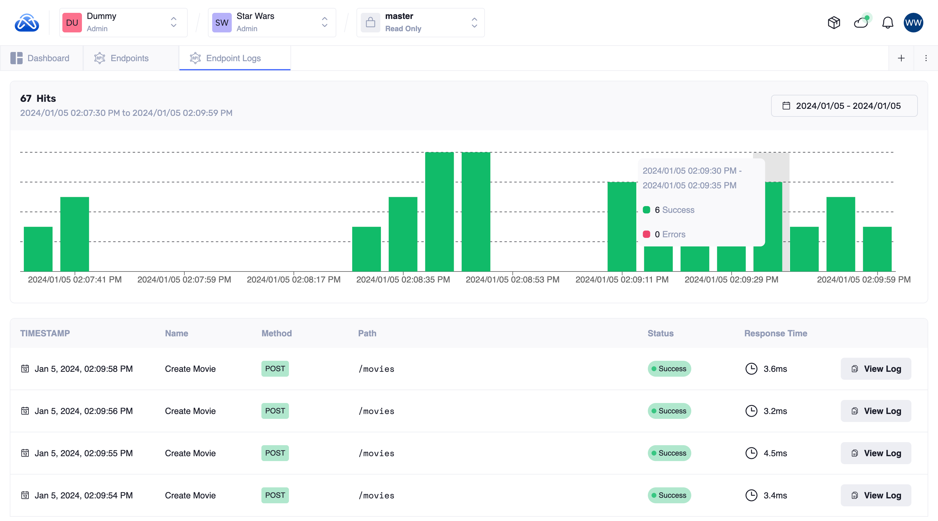 Filter Endpoint Logs: Effortlessly filter endpoint logs by various criteria, such as endpoint name, HTTP method, status, response time, and client. You can also use timestamp filters and create custom filters to quickly locate specific requests and investigate them in detail. Combine multiple filters to create a custom view tailored to your needs.