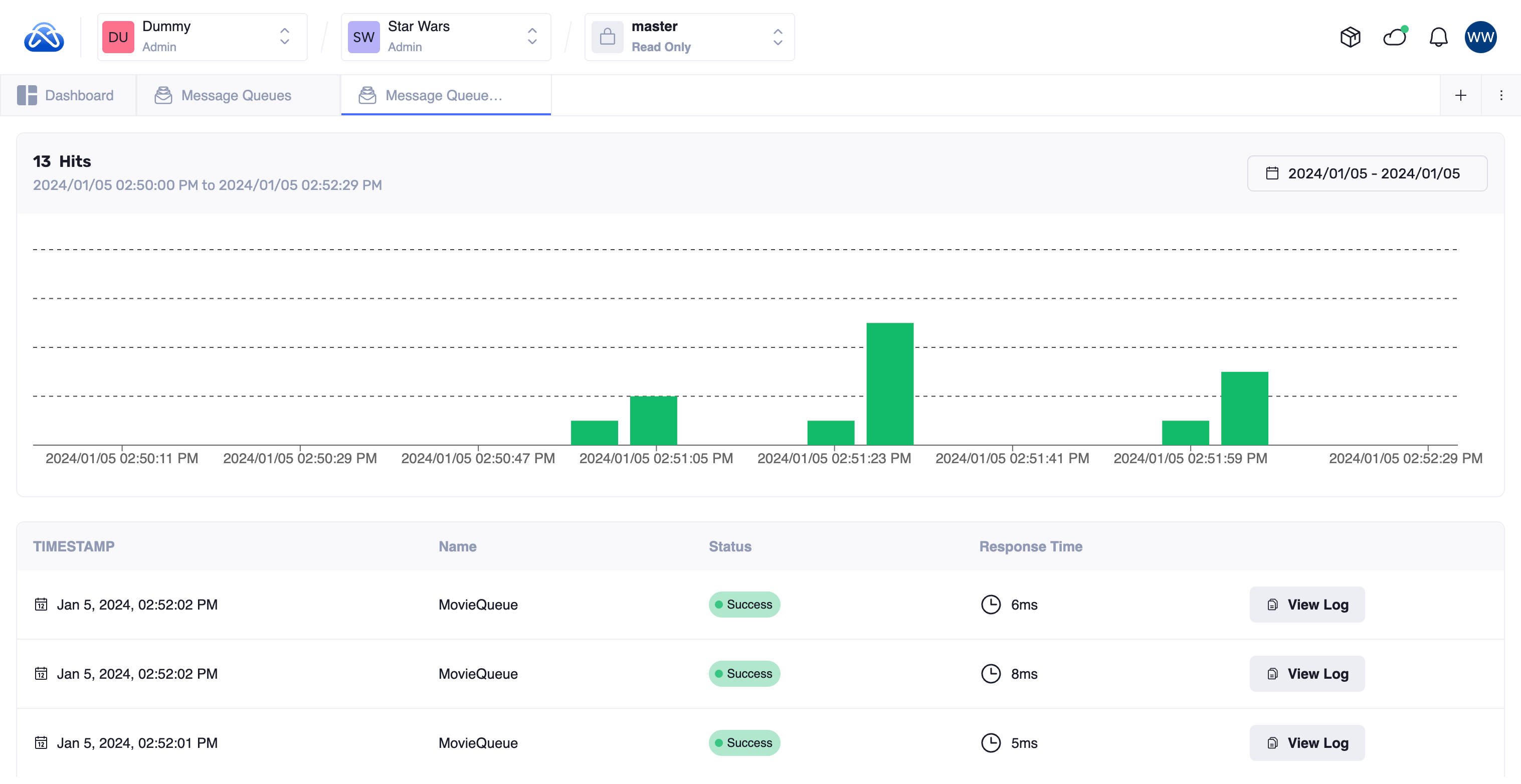 Performance Charts and Logs: Access performance charts over time and detailed logs for each message queue. This comprehensive understanding of message queue health helps you identify trends and patterns impacting performance.