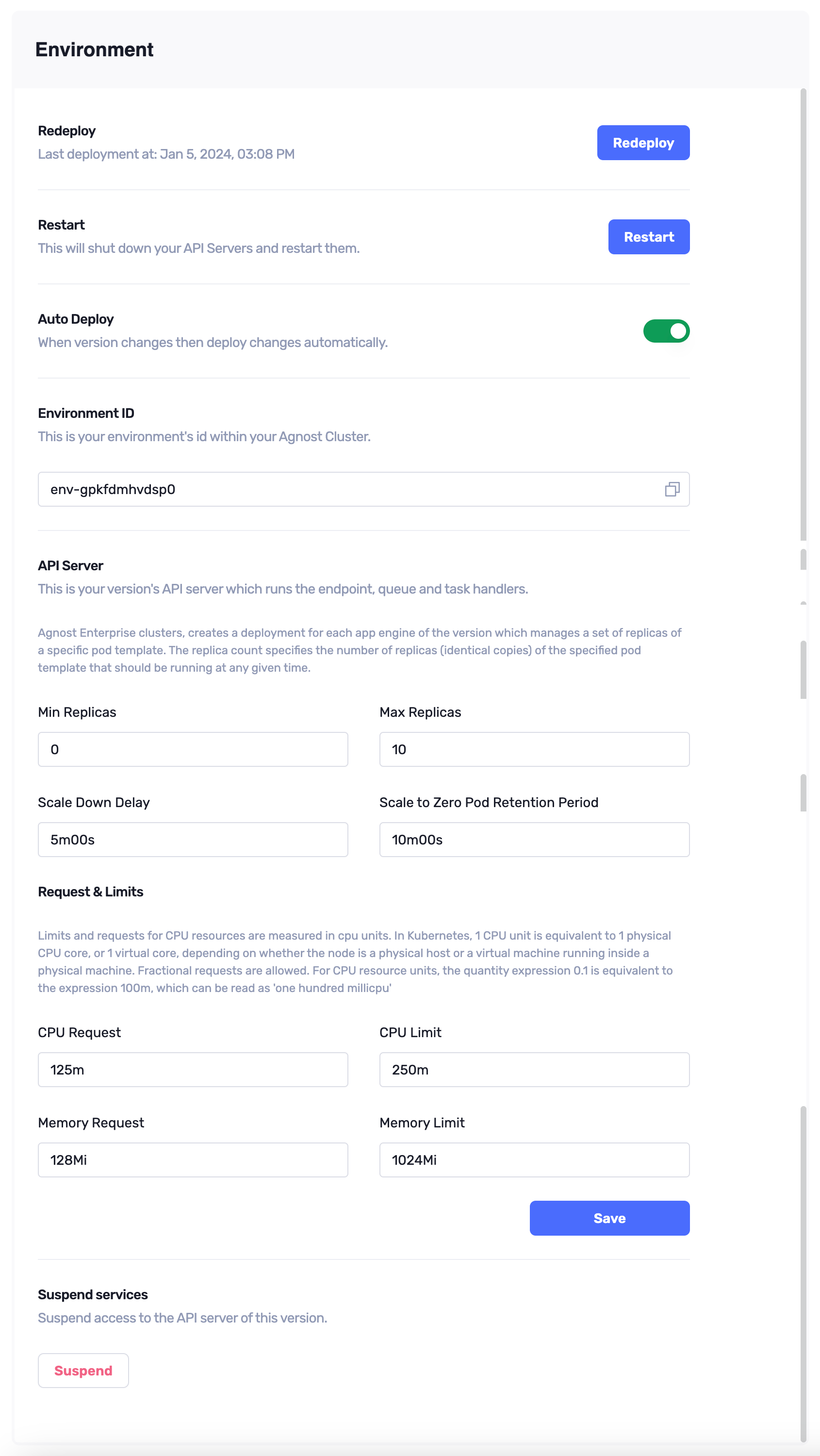 In summary, the Environment settings in Version Settings provide essential configuration options for managing and optimizing your application's deployment. These settings help you control deployment processes, resource allocation, and access to your application's API server effectively.