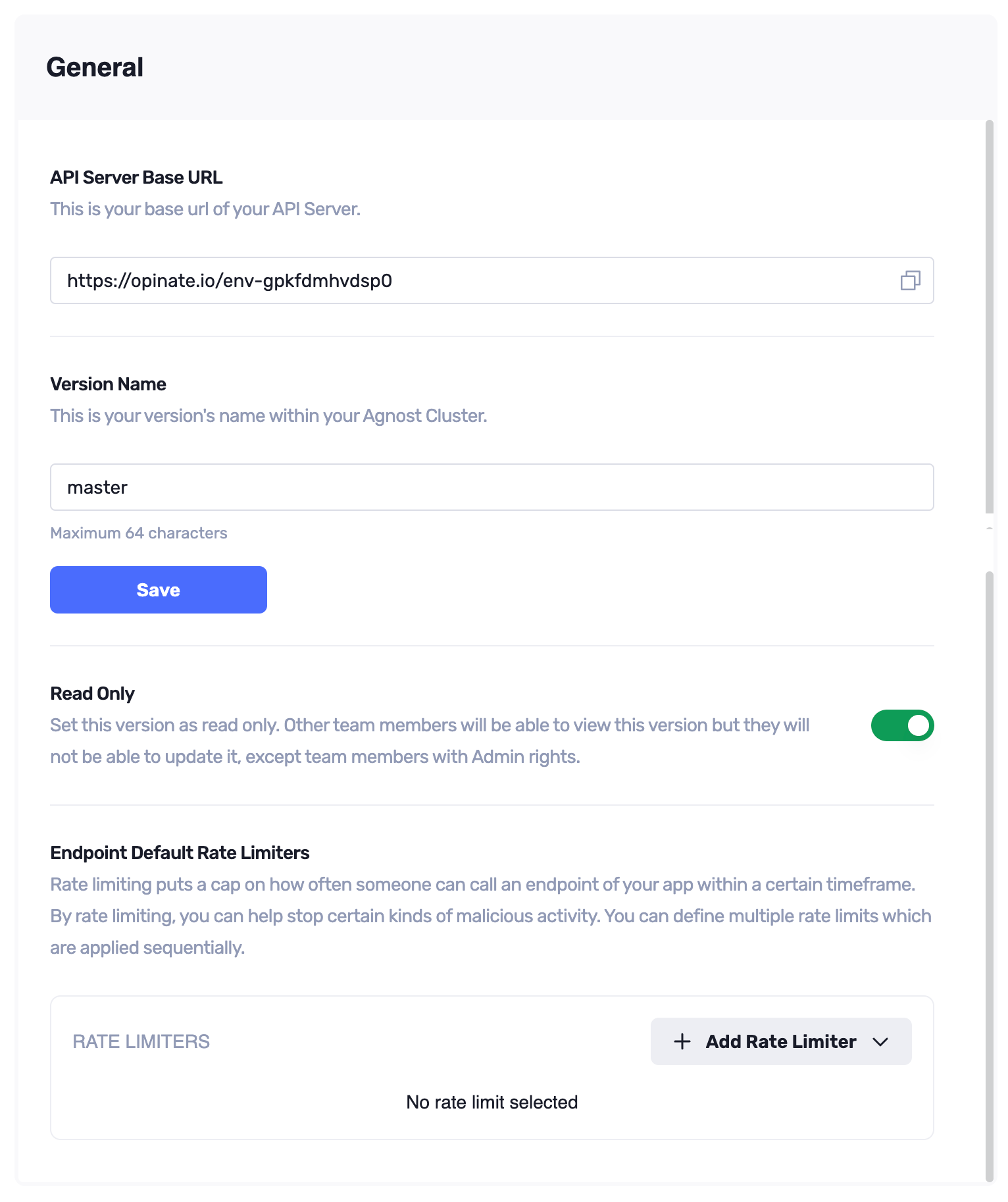 In summary, the General settings in Version Settings provide essential configuration options for your application version, including defining the API Server Base URL, setting the Version Name, controlling read-only access, and configuring rate limiters for your endpoints. These settings help you manage and control the behavior of your application effectively.