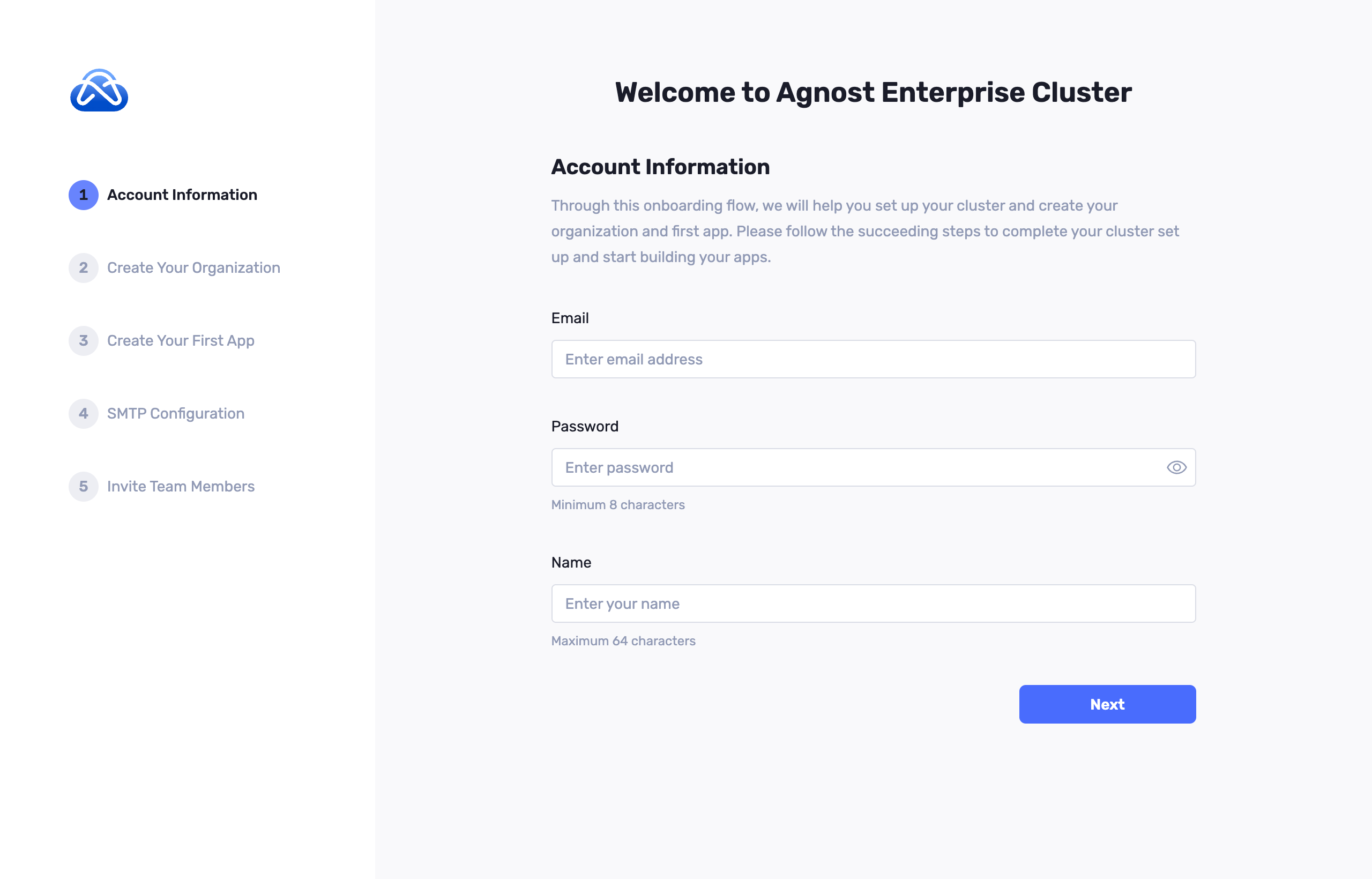 To begin, you need to create your Agnost account. Provide your email address, choose a strong password, and enter your name.