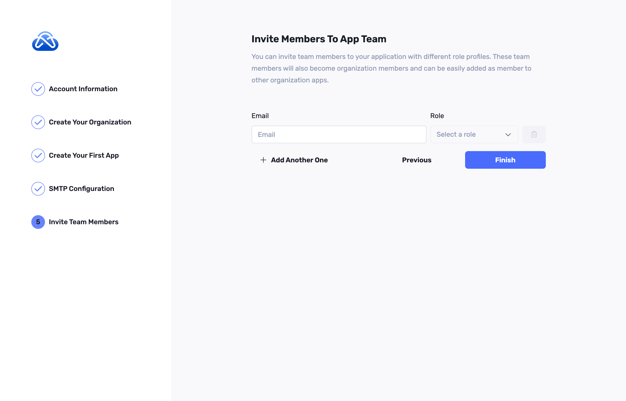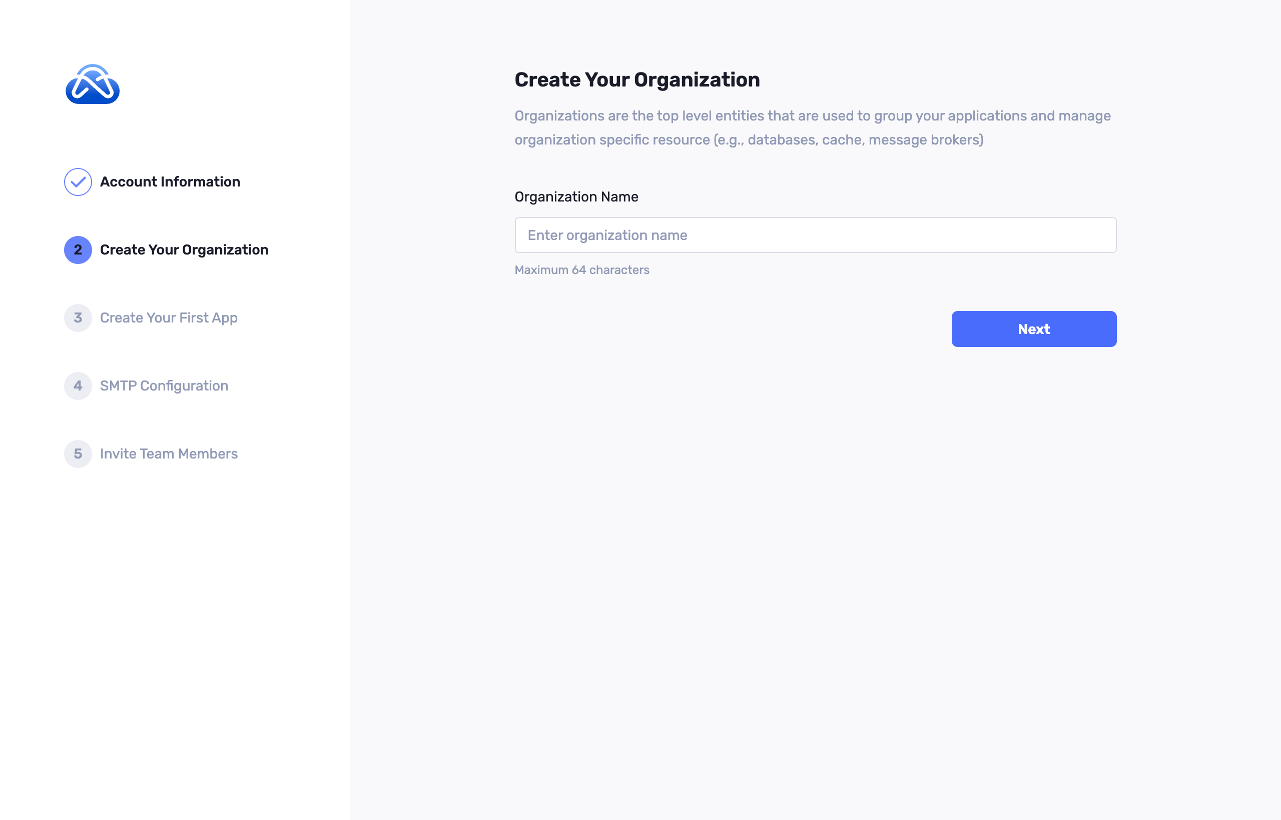 An organization groups together related applications, making it easier to manage applications. After creating your account, you will need to set up your organization.