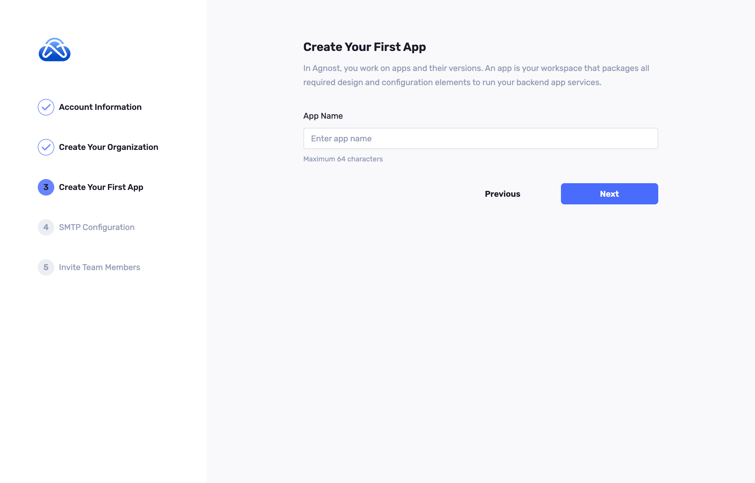 Within your organization, you can create your first application. Each application you create in Agnost represents a distinct project or application you're developing.