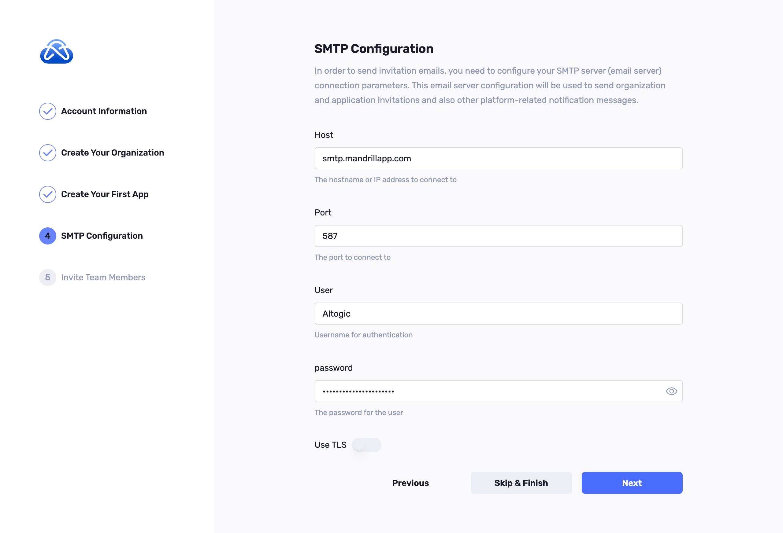 Agnost allows you to configure SMTP settings for email notifications and other communication within your organization. This step is optional, and you can skip it if you don't need SMTP configuration.