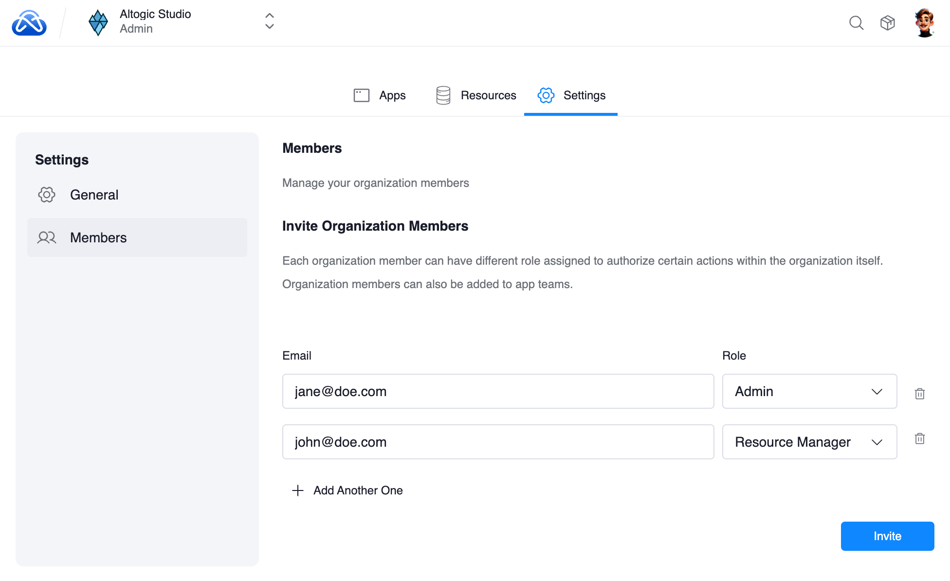 - Role: Select the appropriate role for the member, such as Admin, Developer, Resource Manager or Viewer, depending on the level of access and permissions required.