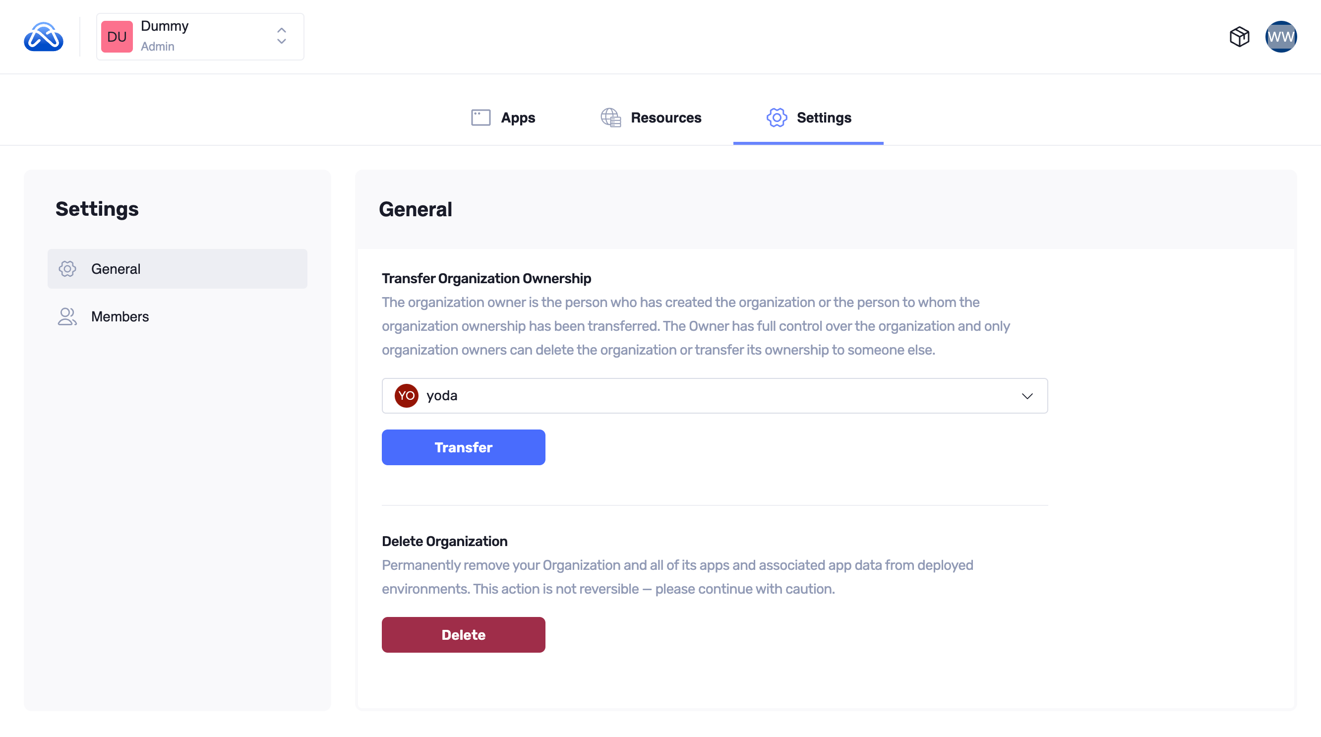 Find the Transfer Organization Ownership option and choose a member from the organization who possesses Admin rights. Confirm the transfer to complete the process.