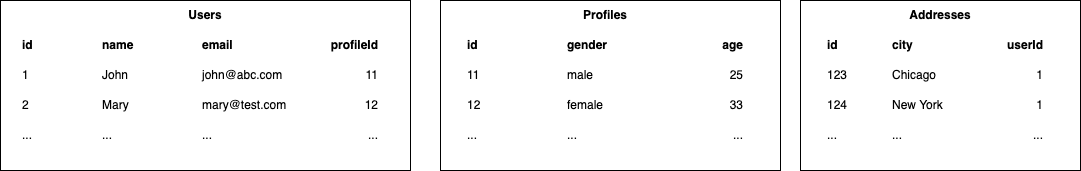 You can also perform multiple joins by specifying the join definitions in an array. For example, assume we also have addresses table where we store the addresses of a user. You can join both profiles and addresses as shown below: